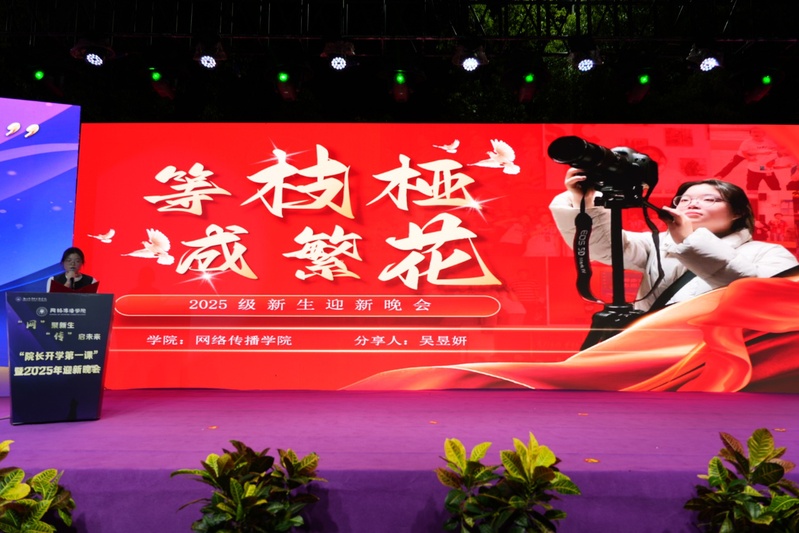 9月25日晚,镜湖校区4号教学楼前灯火辉煌,网络传播学院“院长开学第一课”暨2025年迎新晚会在此隆重举行。学院院长何海翔、党委书记吴月齐、副院长胡秋芬、副院长庄焕明、党委副书记葛丹丹,以及各系部主任、综合办、学工办、优秀校友代表,新生班主任、辅导员、新生班助齐聚一堂,与学院2025级882名新生共同在这充满希望与收获的初秋夜晚,点亮属于“网传人”的第一束聚光灯。 “当小概率极端事件成为常态,唯一确定的就是持续学习。”晚会伊始,何海翔院长以《未来已来:智能社会的到来—从乌卡时代走向巴尼时代》为主题,从智能社会、乌卡时代、巴尼时代三个维度展开,带领2025级新生叩响了新媒体未来世界的大门。面对当今社会人工智能发展对新闻传播领域的介入,何院长提出了“网传方案”:以技术为引擎,文化为罗盘,构建灵活响应、共享协作的组织生态,将不确定性转化为创新增量。课程的最后,何院长鼓励新生用数字思维解码世界,用人文情怀编码未来,用硬核技能与温暖叙事点亮乌卡时代的青春坐标。 旋律一转,Re-Max舞社以活力街舞炸裂开场,霓虹光影与掌声涌动,瞬间点燃现场气氛。优秀校友代表熊骏学长接续登场,他刚从爱尔兰都柏林大学学成归来,以一曲《海阔天空》把“海外升学+国际视野”的亲历故事写进音符,赢得满堂喝彩。 “十佳百优”颁奖环节,镜头聚焦于身边的榜样——优秀学生代表依次登台,由胡秋芬副院长为他们颁发证书,并鼓励大家继续发挥模范带头作用,为学院争光添彩。 “萤火之微,亦能补益山海”,曾两度奔赴“萤火支教”并斩获国赛奖项的吴昱妍学姐,热忱讲述“把微光汇成星河”的历程,展现了网传学子的责任与担当,全场掌声如潮,经久不息。 随后,庄重的聘任乐声响起,新生班主任与新生班助从学院领导们的手中接过聘书,红色烫金的字体在灯光下熠熠生辉,引路星火自此传递。新生班助与优秀校友代表王哲伦学长合唱《网传之歌》,“践行新闻传播的使命,弘扬新媒体人才志气”的责任担当随着旋律刻进每个人的心跳里,大家收获了属于“网传人”的共同记忆。 新生才艺秀接踵而至:戏腔悠扬,《神女劈观》古韵直冲天云;节奏瞬燃,《Better Have My Money》的鼓点扣人心弦;笛声轻诉,《沈园外》双人对唱,把千年沈园唱成今宵烟雨;电音轰鸣,《Dancing Remix》四人齐舞,掌声与激光同频,传统与潮流交替,将晚会的气氛推向高潮。 晚会终章,师生们移步舞台合影留念,快门声与闪光灯交织,定格网络传播学院新学期的新景象。灯光渐暗,4号楼前回归静谧,但属于2025级“网传人”的精彩故事才刚刚开始。他们将以技术为笔,人文为笔,在智能传播的未来世界里,书写无愧于时代、无愧于青春的崭新篇章。