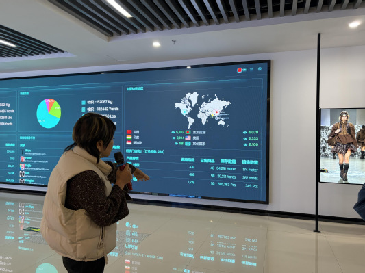 在数字走廊的大屏前,蔡老师指着实时更新的面辅料库存、全球访客分布等数据,为同学们拆解数字化如何支撑业务决策——从针织、梭织的销量统计,到热门采购商的订单情况,这些直观的数字,让大家摸清了时尚产业“用数据说话”的门道。