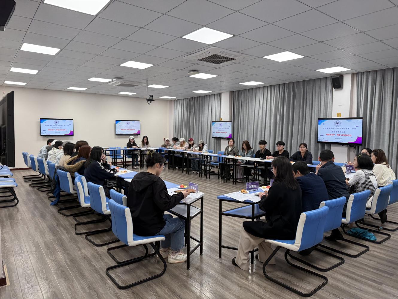 4月22至23日,网络传播学院召开2025-2026学年第二学期期中学生座谈会。学院各系部、综合办、学工办负责人及有关教师代表与学生代表开展了面对面深入交流,旨在全面倾听学生心声、助力学生成长。座谈会由各系部负责人主持。